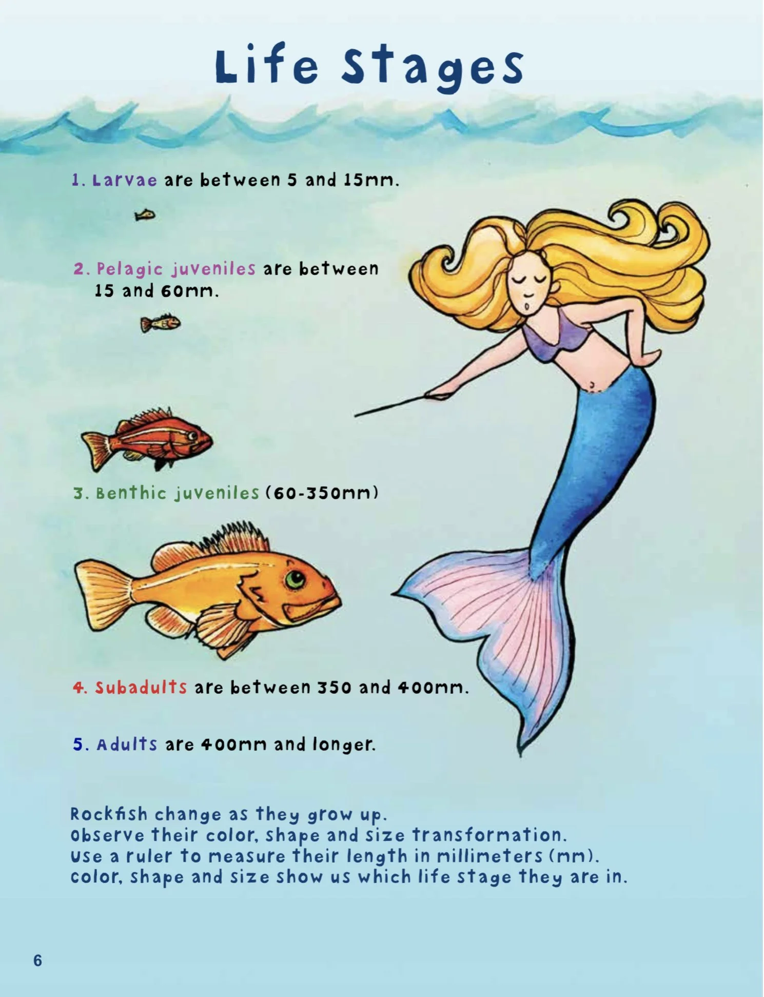 This book swims through the life cycle of two special rockfish. It presents the habitat, prey, predators and morphological changes in each life stage while teaching basic observational skills. This book is for all the little mermaids in training who love learning about the ocean and those who have yet to discover it.